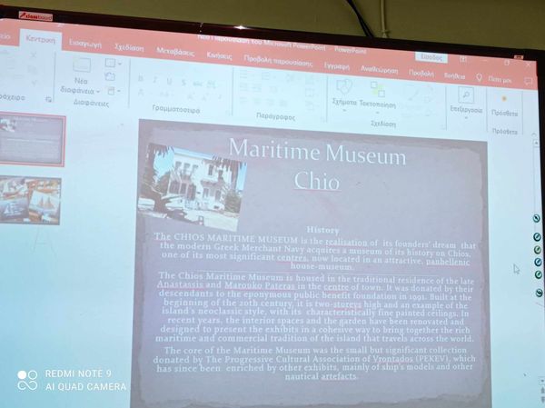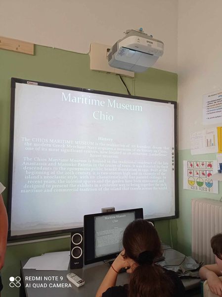Ολοκληρώνοντας το Unit 5 Lesson 3 με τίτλο ”The Museum Leaflet”, οι μαθητές της Στ’ τάξης εργάστηκαν κατά ομάδες και παρουσίασαν σε Powerpoint διαθεματικό project me με θέμα “Τα Μουσεία της Χίου”. Η εργασία συμπεριέλαβε τα ακόλουθα μουσεία: Μουσείο Μαστίχας, Αρχαιολογικό Μουσείο, Ναυτικό Μουσείο καθώς και Ιατρικό Μουσείο. Προβλήθηκαν πληροφορίες τόσο για την ιστορία ίδρυσής τους, όσο και για τα εκθέματά τους. Η δράση υλοποιήθηκε από την εκπαιδευτικό Αγγλικής σε συνεργασία με την κυρία Eυαγγελία Κωνσταντινίδη, η οποία είναι φοιτήτρια και κάνει την πρακτική της άσκηση στο σχολείο.